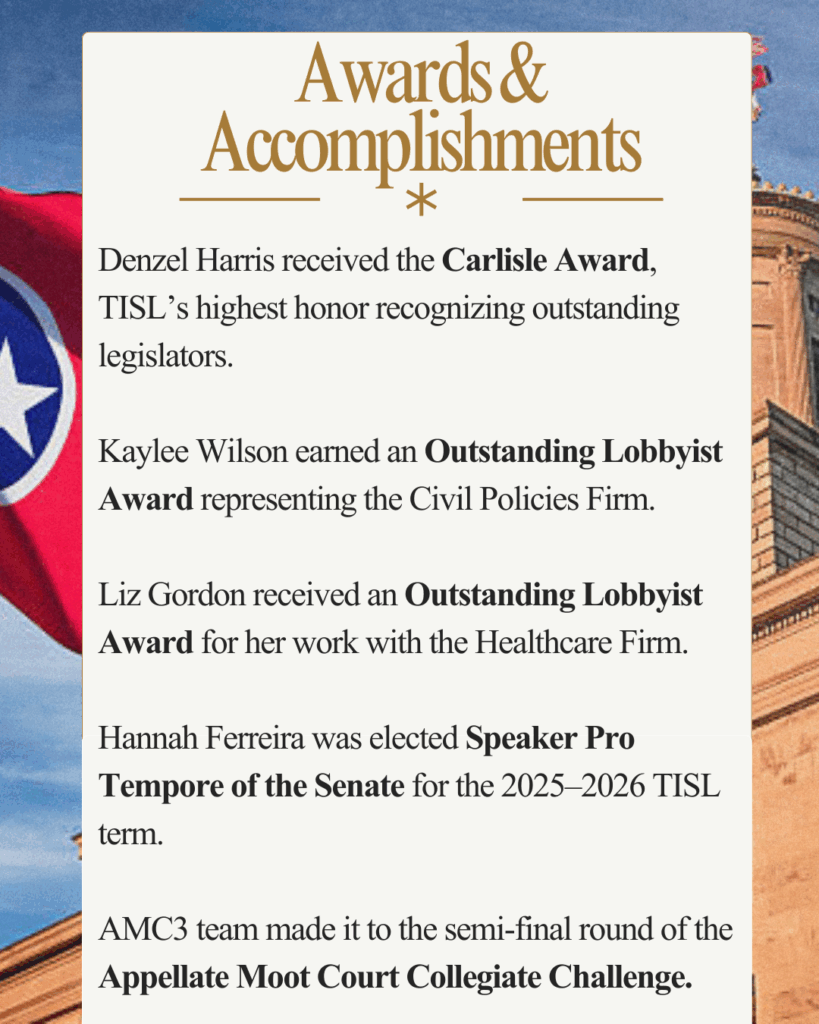 Several MTSU students were recognized for their work during the conference. Denzel Harris received the Carlisle Award, TISL’s highest honor recognizing outstanding legislators. Kaylee Wilson earned an Outstanding Lobbyist Award representing the Civil Policies Firm, and Liz Gordon received an Outstanding Lobbyist Award for her work with the Healthcare Firm. In addition, Hannah Ferreira was elected Speaker Pro Tempore of the Senate for the 2025–2026 TISL term.